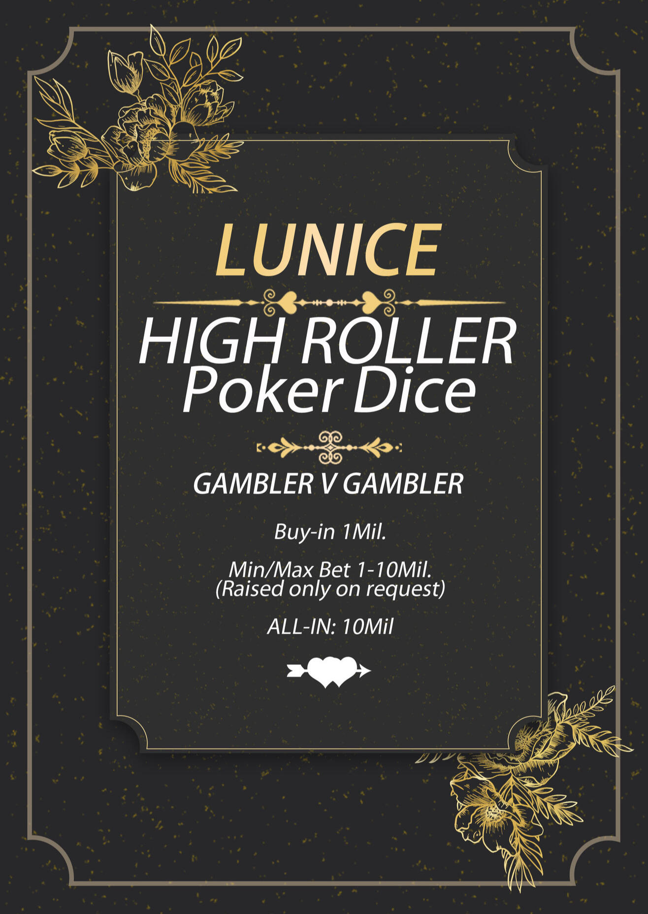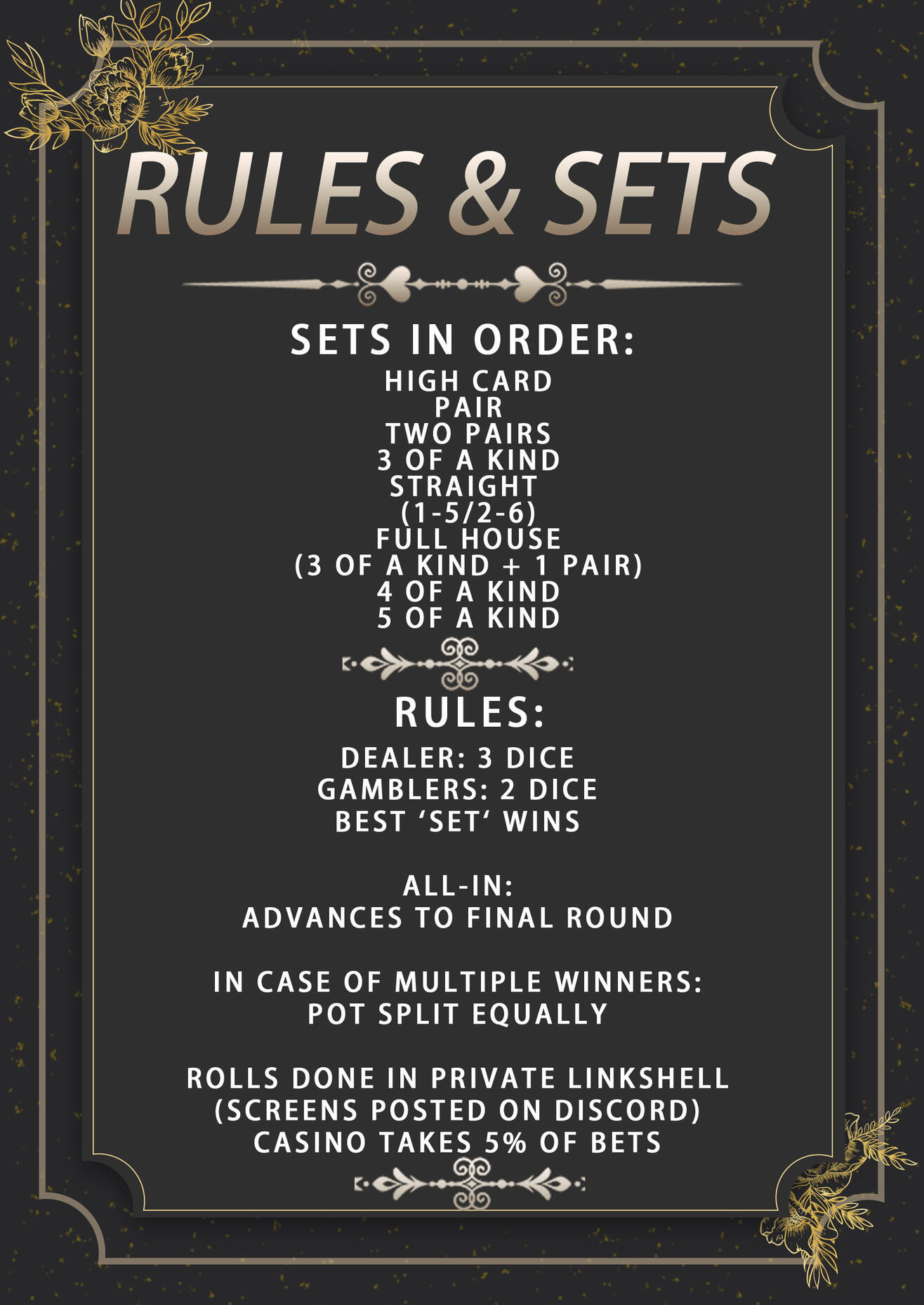 Remember itβs all fun and games at the casino!2. Do not spam the chat too much, but we encourage you to chat with your fellow players and make new friends3. Please stay seated during rounds, and do not switch seats.4.1 Once you trade gil to enter a round, you cannot leave the table or your entry is forfeited