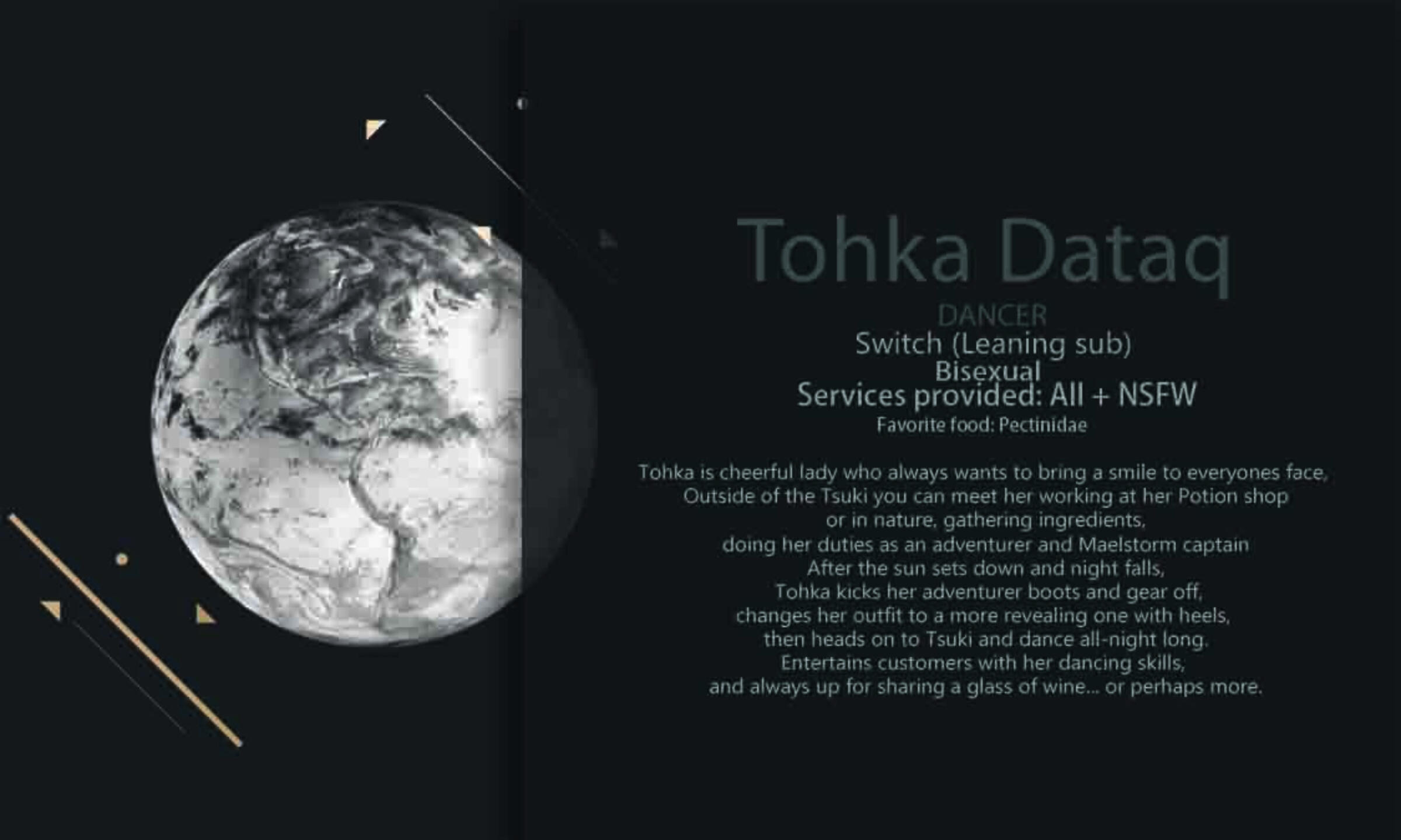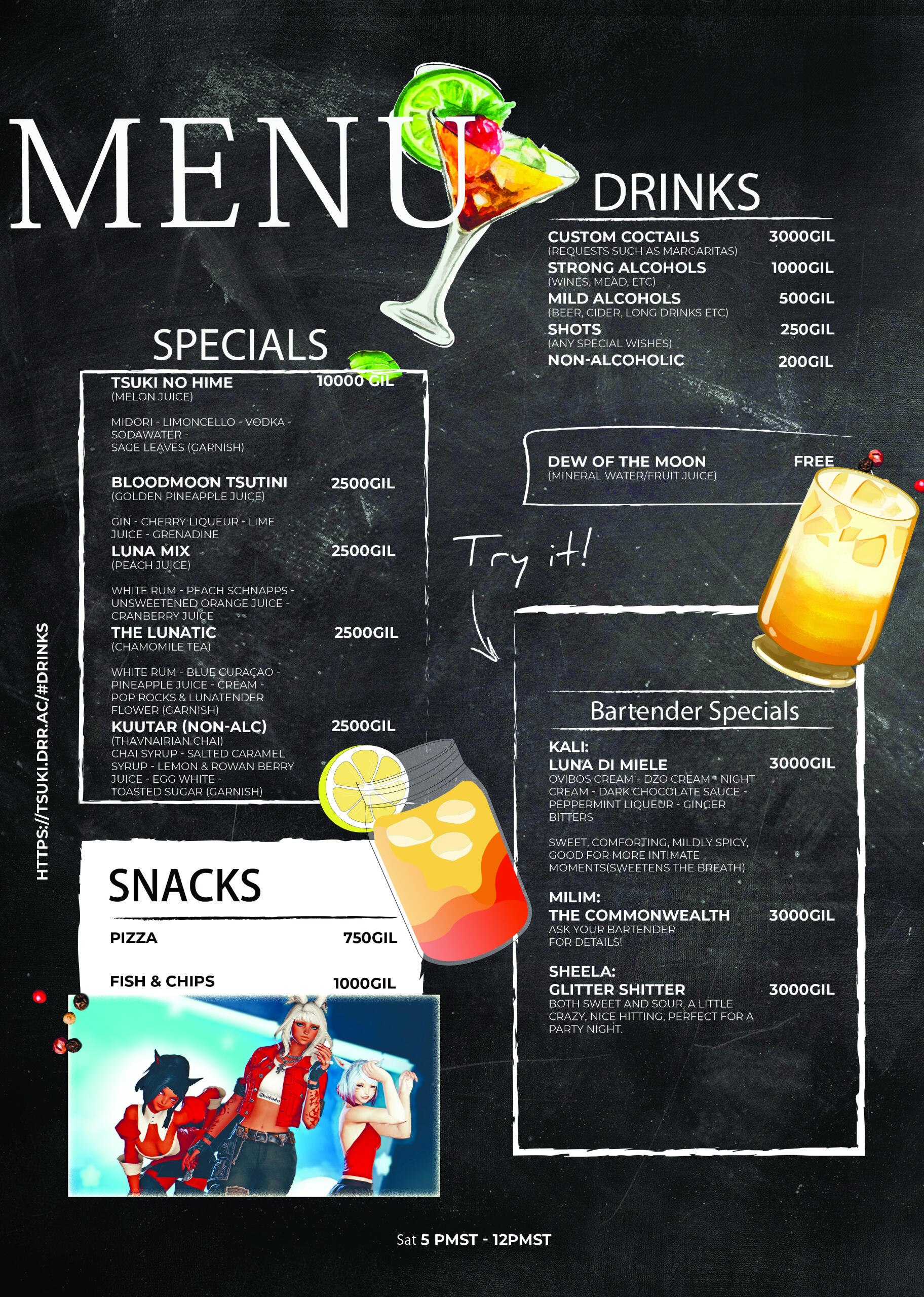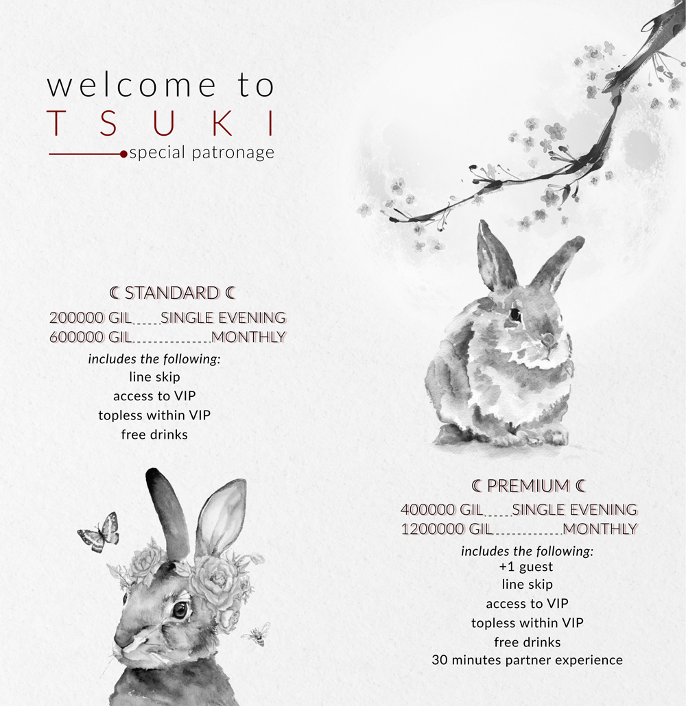 Founded by the FC with the dream of providing a great venue with heart and soul to those who seek to let go and make the best our of their Saturday night.Located in the Mist of Twintania, overlooking the ward and the beach, you can reach the club easily by Limsa Lominsa aetheryte.Live music, gambling, bar and dancers to keep you busy all night we always aim to provide the best and full TSUKI experience.Open every Saturday from 6-12 ST, with 1h pre-party starting at 5 ST to get you hyped and vibed for the night!Join us for TSUKI Saturday!